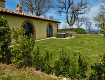 "Villa Falco", 3-rums-hus 100 m2, på bottenvåningen. Rymlig och ljus, mycket smakfullt och stiligt inrett: stort vardags-/matrum med öppen spis, matbord och TV (flatscreen TV), DVD. Utgång till terrassen. 1 dubbelrum med badkar/dusch/bidé/toalett. Utgång till terrassen. 1 dubbelrum. Utgång till terrassen. Öppet kök (ugn, diskmaskin, 5 gasflammor, brödrost, vattenkokare, mikrovågsugn, elektrisk kaffemaskin, köksö). Dusch/bidé/toalett. Luftkonditionering, golvvärme. Naturstensgolv. Bekväm inredning i lantlig stil. Stor terrass, trädgård. Terrassmöbler, vilstolar. Mycket vacker panoramautsikt på landskapet. Till förfogande: tvättmaskin, torktumlare, strykjärn, myggnät, hög barnstol, barnsäng för barn under 2 år, hårtork. Internet (Trådlös LAN [WLAN] , gratis). Parkeringsplats (2 Bilar). Notera: lämpligt för barnfamiljer. Rökfri lägenhet. 1 husdjur/hund tillåtet. Privat entré, privat entré. Inga obligatoriska extra avgifter betalas på plats förutom lokal skatt. Sängkläder, handdukar, slutstädning och energikostnader är inkluderade.- Kännetecken för boendet
