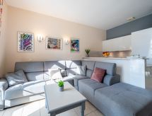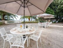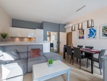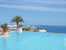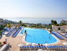 3-rums-lägenhet 50 m2, på bottenvåningen över marknivå. Komfortabelt och vackert inredd: vardags-/matrum med TV (flatscreen TV). Utgång till terrassen. 1 rum med 1 fransk säng (1 x 160 cm, längd 200 cm). Utgång till terrassen. 1 rum med 1 x 2 våningssängar (80 cm, längd 190 cm). Öppet kök (ugn, diskmaskin, 3 Induktionshäll, brödrost, vattenkokare, mikrovågsugn, frys, elektrisk kaffemaskin, kombinerad mikrovågsugn). Badkar, dusch/toalett, sep. Toalett. Luftkonditionering, varmluftsuppvärmning. Stor terrass 300 m2, sydläge. Terrassmöbler. Mycket vacker utsikt på havet. Till förfogande: Internet (Trådlös LAN [WLAN] , gratis). Parkeringsplats vid huset. Notera: rökfri lägenhet. Brandvarnare. 06029023427WF- Kännetecken för boendet