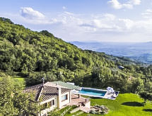 I den charmiga regionen Maremma ligger denna unika egendom, helt inhägnad. Totalt renoverat med lyxstandard, men ändå upprätthållande av toskansk stil, vilket resulterade i en modern villa med all nödvändig komfort. Särskilt vacker är den privata swimmingpoolen där man kan njuta av ett dopp under hela året tack vare det teleskopiska skyddet som håller både vattnet i poolen och omgivningen i en trevlig temperatur. Vackert enfamiljshus "Villa la Vena", fristående, renoverat. I den lilla byn Roccatederighi 3.5 km från centrumet av Sassofortino, soligt, upphöjt läge, 40 km från havet, i det gröna. För privat bruk: tomt 17'000 m2 (inhägnad), vacker trädgård för avkoppling, pool (10 x 5 m, 160 cm djup, tillgång säsongsbunden: 01.Maj. - 31.Okt.) med övertäckning för poolen. Trädgårdsmöbler, utegrill. I huset: internetanslutning. Tillfart (100 m naturväg, bergsväg). Parkering vid huset. Stormarknad 3 km, restaurang 2 km, järnvägsstation "Grosseto" 30 km, sandstrand "Castiglione della Pescaia" 30 km, bad med varma källor "Petriolo" 30 km. Golfbana (18 hål) 30 km, ridstall 15 km. Närbelägna sevärdheter: Roccastrada 10 km, Sito Archeologico Roselle 25 km, Marina di Grosseto 35 km, Punta Ala 50 km, Siena 60 km. Tack vare den dominerande positionen kan man njuta av en vacker panoramautsikt av havet och öarna längst den toskanska kusten.Interior