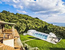 5-rums-villa 170 m2 med 2 våningar. Rymlig, vackert och smakfullt inredd: stort vardags-/matrum med öppen spis och matbord. Utgång till trädgården, till swimmingpoolen. 1 dubbelrum. Utgång till trädgården. 1 rum med 1 säng och 1 utdragbar säng. Dusch/bidé/toalett, sep. Toalett. Övre våning: vardags-/matrum med panoramafönster med TV (flatscreen TV). Utgång till terrassen. 1 dubbelrum. Kokvrå (4 kokplattor, ugn, diskmaskin, mikrovågsugn). Dusch/bidé/toalett, massage-dusch. Stor terrass täckt. Terrassmöbler. Panoramautsikt på havet och dalen. Till förfogande: tvättmaskin, hårtork. Internet (Trådlös LAN [WLAN] , gratis). 1 husdjur/hund tillåtet.- Utrustning