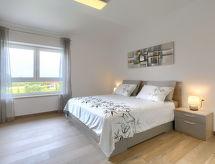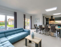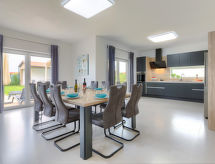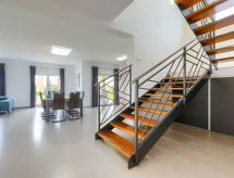 5-rums-ena hälften av ett parhus 170 m2 med 2 våningar. Vackert och modernt inredd: vardags-/matrum med sat-TV och luftkonditionering. Utgång till terrassen, till swimmingpoolen. Öppet kök (ugn, diskmaskin, 4 Induktionshäll, brödrost, vattenkokare, mikrovågsugn, frys, elektrisk kaffemaskin). Utgång till terrassen, till swimmingpoolen. Sep. Toalett. Övre våning: (spiraltrappa) 2 rum, till varje rum hör, 1 fransk säng (180 cm, längd 200 cm), dusch/toalett, sat-TV och luftkonditionering. 2 rum, till varje rum hör 1 säng (80 cm, längd 200 cm), 1 fransk säng (180 cm, längd 200 cm), dusch/toalett, sat-TV och luftkonditionering. Terrass 24 m2. Terrassmöbler, utegrill (flyttbar), vilstolar. Utsikt på swimming-poolen. Till förfogande: kassaskåp, strykjärn, myggnät, hög barnstol, barnsäng, hårtork. Internet (Trådlös LAN [WLAN] , gratis). Garage (2 Bilar). Notera: rökfritt hus.- Utrustning
