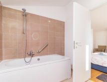 5-rums-hus 150 m2 med 2 våningar, nordostläge. Vackert och modernt inrett: vardags-/matrum 48 m2 med sat-TV (flatscreen TV), luftkonditionering. Utgång till terrassen. 1 rum 10 m2 med 1 fransk säng (160 cm, längd 200 cm), dusch/bidé/toalett och luftkonditionering. Öppet kök (ugn, 2 kokplattor - glaskeramikhäll, 2 gasflammor, brödrost, vattenkokare, mikrovågsugn, frys, elektrisk kaffemaskin). Sep. Toalett. Övre våning: 1 rum 10 m2 med 1 fransk säng (180 cm, längd 200 cm), badkar/bidé/toalett och luftkonditionering. 1 rum 14 m2 med 1 fransk säng (180 cm, längd 200 cm), luftkonditionering. Utgång till balkongen. 1 rum 8 m2 med 2 sängar (90 cm, längd 200 cm), luftkonditionering. Dusch/bidé/toalett. Varmluftsuppvärmning. Balkong 6 m2, terrass 15 m2 täckt. Terrassmöbler, vilstolar. Utsikt på swimming-poolen och landskapet. Till förfogande: kassaskåp, strykjärn, myggnät, hög barnstol, barnsäng. Internet (Trådlös LAN [WLAN] , gratis). Notera: rökfritt hus. 1 husdjur/hund tillåtet.- Kännetecken för boendet