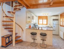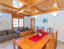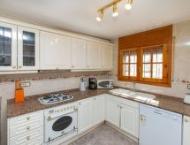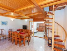 "Villa Palma", 4-rums-villa 105 m2 med 2 våningar. Komfortabelt och mysigt inredd: vardagsrum med 1 bäddsoffa (120 cm), sat-TV och digital-TV. Utgång till terrassen. Matrum med matbord. 1 rum med 1 säng (90 cm), 1 fransk säng (135 cm). Öppet kök (4 kokplattor, ugn, diskmaskin, brödrost, vattenkokare, mikrovågsugn, elektrisk kaffemaskin) med bar. Badkar/toalett med hörnbadkar. Ingen uppvärmningsmöjlighet. Övre våning: (spiraltrappa) 1 rum med snedtak med 4 sängar (90 cm). Terrass. Terrassmöbler, utegrill. Till förfogande: tvättmaskin, strykjärn, hög barnstol, barnsäng, hårtork. Internet (Trådlös LAN [WLAN] , gratis). Parkeringsplats vid huset. Notera: 1 husdjur/hund tillåtet. TV bara ES, DE, FR. HUTTE001227- Utrustning