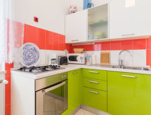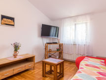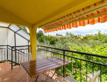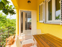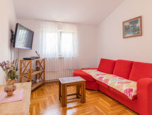 "Villa Sandra (PUL413)", 4-rums-lägenhet 97 m2 på 1. våningen. Vardags-/matrum med 1 bäddsoffa, köksblock och sat-TV (flatscreen TV). 1 rum med 1 säng och 1 dubbelsäng. Vardags-/matrum med 1 bäddsoffa för 2 personer (160 cm), sat-TV (flatscreen TV). 1 rum med 1 säng och 1 dubbelsäng. Kök (1 kokplatta, ugn, 3 gasflammor, brödrost, vattenkokare, frys, elektrisk kaffemaskin). 2 duschar/toaletter. Balkong 10 m2, terrass 9 m2, täckt, terrass 18 m2. Terrassmöbler, utegrill. Till förfogande: myggnät. Internet (Trådlös LAN [WLAN] , gratis). Notera: rökfri lägenhet. Max 2 husdjur/hundar tillåtna. Poolen som nämns i beskrivningen är för eget bruk. Lägenheten består av 2 lägenheter på första våningen, som hyrs som en enhet.- Utrustning