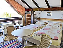 6-rums-hus 128 m2 med 2 våningar, på bottenvåningen. Objekt passande för 8 vuxna + 1 barn. Vardagsrum med sat-TV och DVD. Utgång till balkongen. Matrum. 1 rum med 1 dubbelsäng. 1 rum med 2 sängar. Utgång till balkongen. Kök (ugn, diskmaskin, mikrovågsugn, frys, elektrisk kaffemaskin). Badkar/toalett, dusch/toalett. Övre våning: 1 rum med snedtak med 1 dubbelsäng. Utgång till balkongen. 1 rum med snedtak med 1 bäddsoffa och 1 dubbelsäng. Utgång till balkongen. Eluppvärmning. Gräsmatta. Balkongmöbler, utegrill (flyttbar). Till förfogande: telefon, hög barnstol. Egnahemshus. Spiraltrappa till övervåningen.- Aktiviteter i närheten