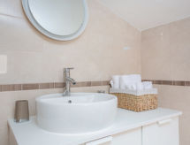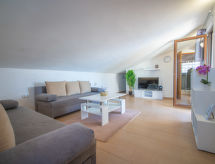 "Wind Soleil", 2-rums-lägenhet 45 m2, på takvåningen. Vardags-/matrum, takhöjd 116 - 228 cm med 2 bäddsoffor (120 cm, längd 190 cm), TV och luftkonditionering. Utgång till terrassen. 1 rum, takhöjd 116 - 228 cm med 1 fransk säng (160 cm, längd 200 cm). Öppet kök (ugn, diskmaskin, 2 kokplattor - glaskeramikhäll, vattenkokare, mikrovågsugn, frys), takhöjd 116 - 228 cm. Dusch/bidé/toalett. Terrass 20 m2. Terrassmöbler, utegrill (flyttbar). Härlig utsikt på havet. Till förfogande: tvättmaskin, hårtork. Internet (Trådlös LAN [WLAN] , gratis).- Utrustning