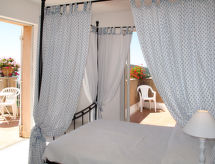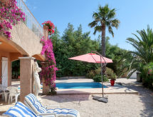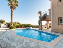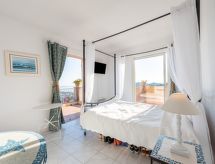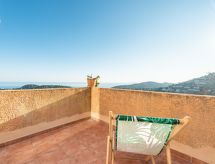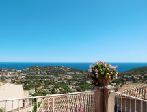 4-rums-hus 110 m2 med 2 våningar, sydvästläge. Komfortabelt och vackert inrett: vardags-/matrum med panoramafönster med öppen spis (endast för dekoration), matbord och sat-TV (flatscreen TV), eluppvärmning och luftkonditionering. Utgång till terrassen, till swimmingpoolen. 1 rum med 1 dubbelsäng (2 x 90 cm, längd 190 cm), badkar/toalett. 1 rum med 1 dubbelsäng (2 x 90 cm, längd 190 cm), sittbadkar/toalett. Kök (miniugn, diskmaskin, 4 kokplattor - glaskeramikhäll, brödrost, vattenkokare, mikrovågsugn, frys, elektrisk kaffemaskin, Kapslar till kaffemaskin (Expresso) extra). Övre våning: 1 rum med 1 fransk säng (140 cm, längd 190 cm), badkar, bidé, sep. toalett och TV (flatscreen TV), luftkonditionering. Utgång till balkongen, till terrassen. Balkong 6 m2, sydläge, terrass 12 m2, täckt, sydläge och västläge terrass 12 m2. Terrassmöbler, balkongmöbler, elektrisk grill, vilstolar (6). Mycket vacker utsikt på havet och landskapet. Till förfogande: tvättmaskin, strykjärn. Internet (Trådlös LAN [WLAN] , gratis). Parkeringsplats (täckt, inhägnad, 2 Bilar). Notera: brandvarnare.- Utrustning