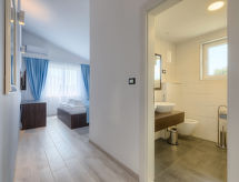 Šišan 4 km Medulin: Güzel villa "Alba", üstünde 2 katlı, yapım yılı 2019. 900 m ın merkezinde Šišan, 8 km in merkezinde Pula, sakin/sessiz, güneşli yer, 2 km denizden, 2 km kumsaldan. Tek kişilik kullanım için: arsa 2'000 m2 (çitle çevrili), güzel bahçe ile çim ve bitki, 2 yüzme havuzları köşeli (10 5 m, 140 cm derin, Sezonluk kullanılabilirlik: 04.Apr. - 24.Oct.) ile içerden merdivenli. Havuz alanında tuvalet, dış duş, yüzme havuzlu ev ile duş, masa tenisi, bahçe mobilyası, mangal, çocuk parkı (kaydırak, salıncak). Evde: internet kullanımı, jakuzi, kızılötesi sauna, langırt, trampolin, çamaşır makinesi. Giriş e kadar eve (300 m doğa yolu). Otopark (için 4 arabalar, kapalı) evin orda arsada. Marketler 800 m, süper market 6 km, Restaurant 650 m, çakıl taşlı plaj 2 km, kayalıklı kumsal 2 km. Sörf okulu 4 km, yenken sporu okulu 4 km, tenis 6 km, binicilik 1 km, yoldan yüyüyüş yolları mevcut 100 m, bisiklet yolu 150 m.Interior