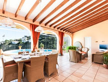 "Villa Da Vinci", 8 odalı Villa 390 m2. Havadar ve aydınlık, çok konforlu ve zevkli dayalı döşeli: oturma /yemek odası 60 m2 ile açık şömine. Terasa, verandaya, havuza çıkışlı. Oturma odası ile açık şömine, TV, Uydu-TV, Radio, CD, müzik seti ve DVD. 1 büyük oda, Giyinme odası ile 1 french bed (180 cm, uzunluk 190 cm), banyo/duş/bide/tuvalet, çift lavabo, klima ve fanlı ısıtma. 1 oda ile 1 french bed (150 cm, uzunluk 190 cm), klima ve fanlı ısıtma. Büyük mutfak 24 m2 (5 ocak, fırın, bulaşık makinesi, mikro dalga fırın, derin dondurucu, kahve makinesi). Terasa çıkışlı. Ayrı WC. Alt kat: (dış merdiven) salon. 1 oda ile 1 ikili yatak (2 90 cm, uzunluk 190 cm), gazlı ısıtma, klima ve fanlı ısıtma. 1 oda ile 1 x 2 ranza (90 cm, uzunluk 190 cm), gazlı ısıtma, klima ve fanlı ısıtma. Banyo/duş/WC, çift lavabo. Üst kat: 1 oda ile 1 french bed (180 cm, uzunluk 190 cm), banyo/WC ve çift lavabo (özel) dijital tv, klima ve fanlı ısıtma. Büyük teras 32 m2. Teras mobilyası, bahçede mangal, şezlong 6 adet). Harika panoramik Deniz, Dağ, Vadi, Havuz, Bahçe ve koy manzaralı. Hizmetinize sunulan: çamaşır makinesi, çamaşır kurutucusu, çocuk yemek sandalyesi, çocuk yatağı, fön makinesi. Internet (Wireless LAN, ücretsiz). IPod bağlantı noktası. Garaj (2). Dikkat: sigara içilmeyen ev. Sadece TV ES, GB. Duman dedektörü. AT-452715-A Deniz ve yer manzarası muhteşem. Barbekü için uygundur. Evin ayrıca özel bir havuzu ile donatılmıştır. Evde ayrıca bir internet bağlantısı ile donatılmıştır. Kablosuz bir LAN (kablosuz yerel alan ağı) mevcuttur. Bir çamaşır kurutma makinesi mevcuttur. DVD oynatıcı var. Bir mikrodalga fırın da mevcuttur.- Konaklama özelliklerinin özellikleri