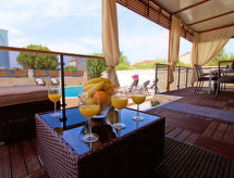 4 odalı mobil ev 37 m2, güney bölgesi. Oturma /yemek odası ile TV (LCD ekran), klima. Terasa çıkışlı. 1 oda ile 1 french bed (140 cm, uzunluk 200 cm), duş/WC. 1 oda ile 2 adet yatak (80 cm, uzunluk 200 cm). 1 oda ile 2 adet yatak (70 cm, uzunluk 200 cm). Amerikan mutfak (4 cam seramik taban, mikro dalga fırın). Duş/WC. Teras 25 m2, kapalı. Teras mobilyası. Havuz manzaralı. Hizmetinize sunulan: fön makinesi. Internet (Wireless LAN, ücretsiz). Mülkiyet tamamen çitle çevrili. Yazları serinletmek için bu tatil evinde klima vardır. Bir havuzu var. Isıtmalı bir havuz mevcuttur. Bir mikrodalga fırın mevcuttur.- tesisler