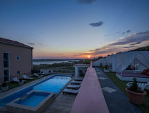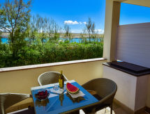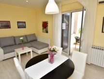 2 odalı daire 46 m2, yüksek zeminde, güney doğu cephesi. Oturma /yemek odası 20 m2 ile 1 çift kişilik divan yatak, Uydu-TV ve klima. Terasa çıkışlı. 1 oda ile 1 french bed (160 cm, uzunluk 200 cm). Amerikan mutfak (2 ocak, bulaşık makinesi, mikro dalga fırın). Banyo/WC. Teras 7 m2, teras 15 m2 kısmen kapalı. Teras mobilyası, bahçede mangal. Sınırlı, Deniz manzaralı. Hizmetinize sunulan: ütü, fön makinesi. Internet (Wireless LAN, ücretsiz). Bir küvet mevcuttur. Bir bulaşık makinesi mevcuttur. Bir mikrodalga fırın mevcuttur.- tesisler