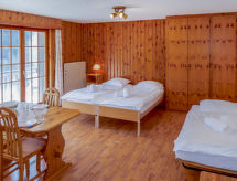 "Mont-Soleil 2&3", 4 odalı daire 130 m2 'de/da 1. kat. Basit dayalı döşeli: oturma odası, sürgülü kapı ile 2 adet duvara katlanabilir yatak (90 cm, uzunluk 200 cm), açık şömine ve kablolu TV. Balkona çıkışlı, doğu yönü ve güney yönü. 1 oda ile 1 x 2 ranza (90 cm, uzunluk 200 cm). Balkona çıkışlı, kuzey yönü. 1 oda ile 1 french bed (140 cm, uzunluk 200 cm). 1 çift kişilik oda 30 m2 ile 3 adet yatak (90 cm, uzunluk 190 cm), banyo/WC. Balkona çıkışlı. Mutfak (3 ocak, bulaşık makinesi, mikro dalga fırın, derin dondurucu). Banyo/WC, ayrı WC. 3 adet balkon. Balkon mobilyası. Dağ ve Vadi manzaralı. Hizmetinize sunulan: Internet (Wireless LAN, ücretsiz). Dikkat: bir çift kişilik oda dairenin dışında. Sigara içilmez daireler. Bir küvet mevcuttur.- tesisler
