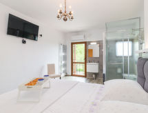 6 odalı ev 130 m2 üstünde 2 kat. Oturma /yemek odası ile Uydu-TV (LCD ekran), odun sobası. Terasa çıkışlı. Giriş ile klima. 2 adet oda, her oda ile 1 french bed (160 cm, uzunluk 200 cm). 1 oda ile 1 french bed (160 cm, uzunluk 200 cm), duş/WC. Terasa çıkışlı. Amerikan mutfak (1 ocak, fırın, bulaşık makinesi, 3, mikro dalga fırın, kahve makinesi). Duş/WC. Odun sobası. Üst kat: (dış merdiven) oturma /yemek odası ile 1 çift kişilik divan yatak ve Uydu-TV (LCD ekran), klima. Balkona çıkışlı. 1 oda ile 1 ikili yatak (160 cm, uzunluk 200 cm), duş/WC. Balkona çıkışlı. Yemek pişirme yeri (2 cam seramik taban). Mazotlu ısıtma. 2 adet balkon. Şezlong. Hizmetinize sunulan: odun (ücretsiz). Internet (Wireless LAN, ücretsiz). Dikkat: sigara içilmeyen ev. Maximum 1 pet/ dog allowed. Geceleri çok sıcak kalsa bile, güzel, klimayı açabilir ve hoş ılıman bir iç mekan ikliminde uyuyabilirsiniz. Özel bir havuz mevcuttur. Çocuk havuzu mevcuttur. Kablosuz bir LAN (kablosuz yerel alan ağı) mevcuttur.- tesisler