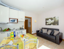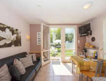 "Deluxe Apartment Village", 2 odalı daire 35-e kadar 50 m2, zemin katta. Güzel dayalı döşeli: oturma/yatak odası ile 1 çift kişilik divan yatak, yemek masası ve TV. Bahçeye çıkışlı. 1 çift kişilik oda. Amerikan mutfak (4, mikro dalga fırın, kahve makinesi). Duş/WC. Gazlı ısıtma. 15.10. 15.04. Taş zemin. Bahçe oturma yeri, bahçe. Teras mobilyası. Hizmetinize sunulan: çocuk yemek sandalyesi, çocuk yatağı, 2 yaş 'a kadar (ekstra). Internet (Wireless LAN, ücretsiz). Maximum 2 pets/ dogs allowed. CIR: 013189-RTA-00005 Bu tatil kompleksi içinde doğrudan bir restorandır. Bir sundurma var. Bebek karyolası mevcuttur. Masa Tenisi masası var. Bir mikrodalga fırın da mevcuttur.- tesisler