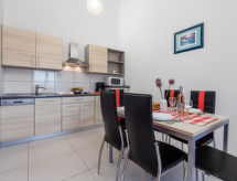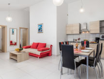 3 odalı daire 51 m2, zemin katta, kuzey bölgesi. Oturma /yemek odası 33 m2 ile 1 çift kişilik divan yatak, Uydu-TV ve klima. Terasa çıkışlı. 2 adet oda, her oda ile 1 ikili yatak (2 80 cm, uzunluk 200 cm). Amerikan mutfak (bulaşık makinesi, 4 cam seramik taban, mikro dalga fırın, kahve makinesi). Duş/WC. Teras 22 m2 kısmen kapalı. Teras mobilyası. Etkileyici ısı, beden ve zihin üzerinde ağır bir yük yaratabilir. Bu nedenle, tesis klima ile donatılmıştır. Bir çocuk havuzu var.- tesisler